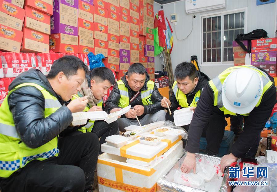 1月24日,在武汉火神山医院建设工地工棚内,来自中建三局的电工彭咏召、测量员严伟才和罗斌、运输员吕俊、机电安装员陈金鹏(从左至右)在吃盒饭。 除夕夜,武汉火神山医院建设工地灯火通明,建设团队放弃与家人团聚,加紧建设这座专门医院。 武汉市参照2003年抗击非典期间北京小汤山医院模式,正在蔡甸区建设的专门医院正式命名为火神山医院。新医院计划于2月3日建成,集中收治新型冠状病毒感染的肺炎患者。 新华社记者 肖艺九 摄
