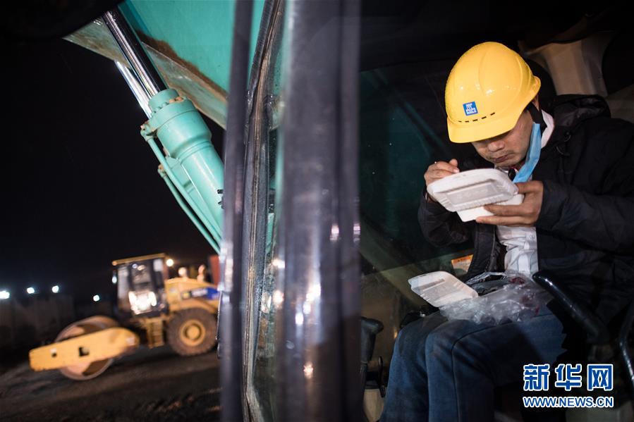 1月24日,在武汉火神山医院建设工地,来自中建三局的挖掘机驾驶员毛元斌在吃盒饭。 除夕夜,武汉火神山医院建设工地灯火通明,建设团队放弃与家人团聚,加紧建设这座专门医院。 武汉市参照2003年抗击非典期间北京小汤山医院模式,正在蔡甸区建设的专门医院正式命名为火神山医院。新医院计划于2月3日建成,集中收治新型冠状病毒感染的肺炎患者。 新华社记者 肖艺九 摄