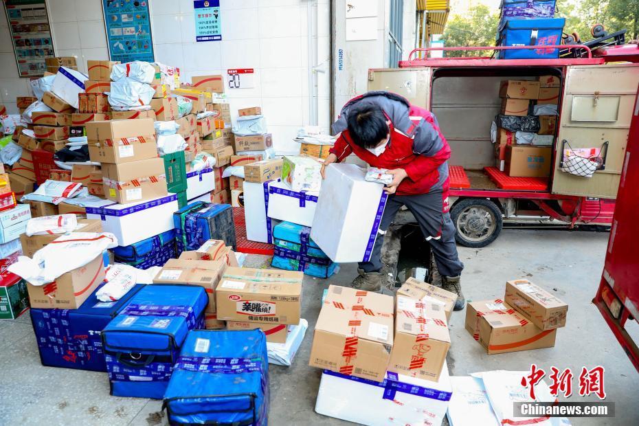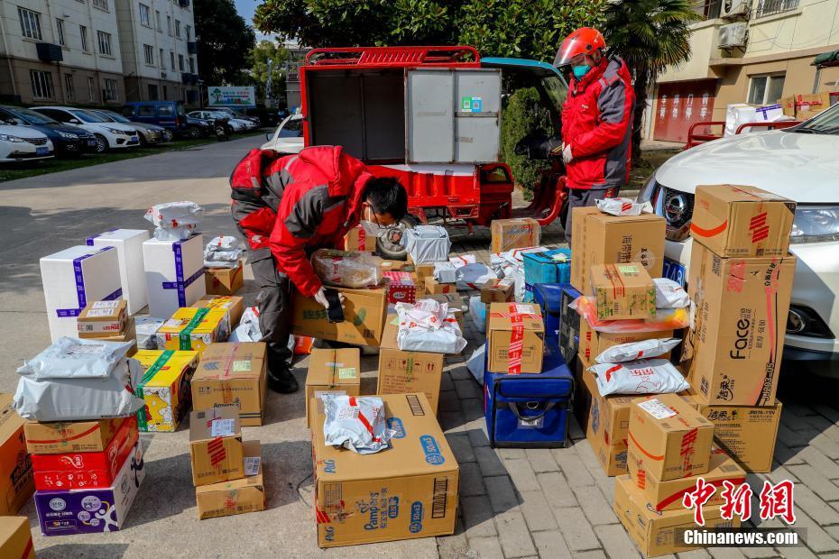 2月9日,武汉汉口常青花园社区,快递员卸下快件等待客户前来取件。新冠肺炎疫情之下,大批民众选择线上购物,快递员比往常更忙碌。中新社记者 张畅 摄