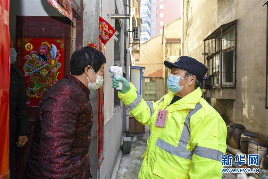 2月20日,62岁的退休民警刘汉楚在孝感市孝南区九真社区为居民测量体温。