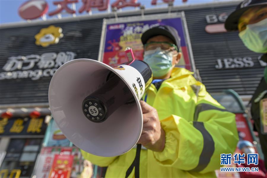 2月20日,64岁的退休民警汪柏林在孝感市城区的一家超市前开展防疫宣传工作。新华社记者 胡虎虎 摄