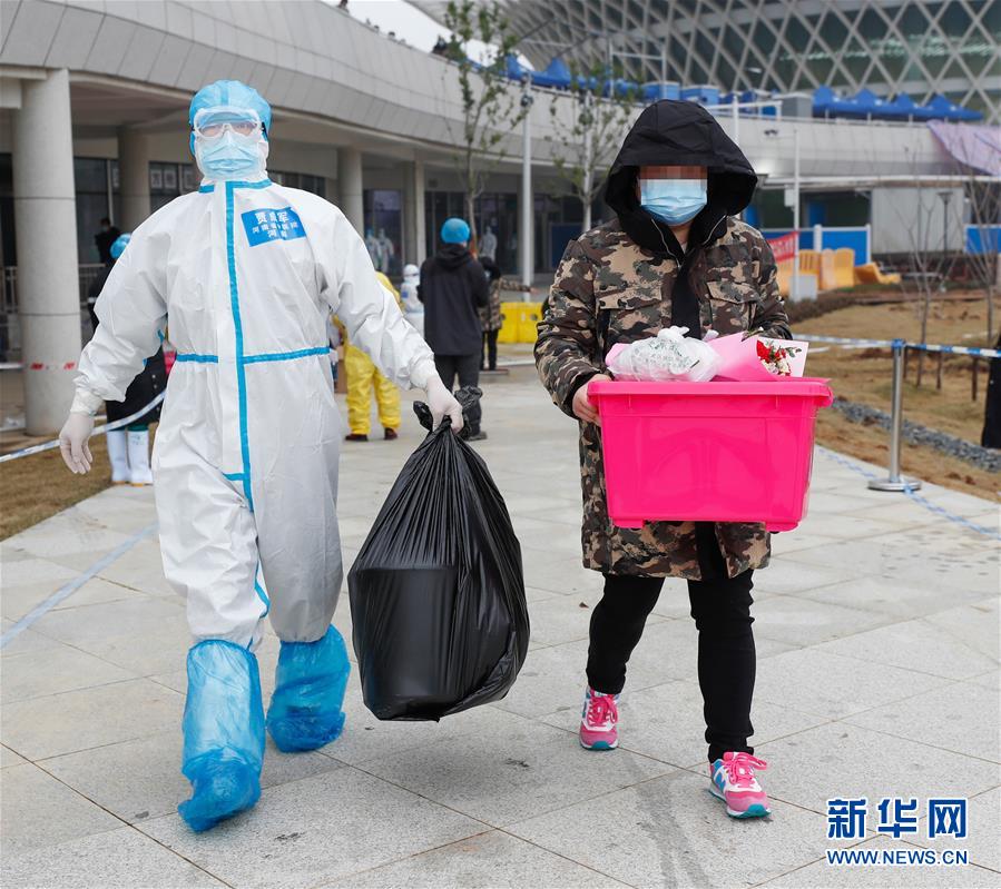 2月26日,治愈患者携带个人物品准备接受消毒后离开江夏方舱医院。新华社记者 沈伯韩 摄