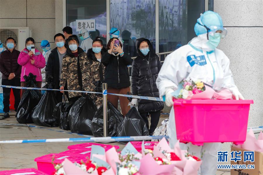 2月26日,治愈患者携带个人物品和医院赠送的鲜花、中药等离开江夏方舱医院。新华社记者 沈伯韩 摄
