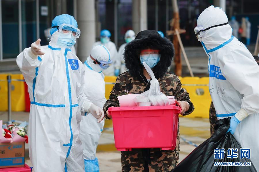2月26日,治愈患者携带个人物品和医院赠送的鲜花、中药等离开江夏方舱医院。