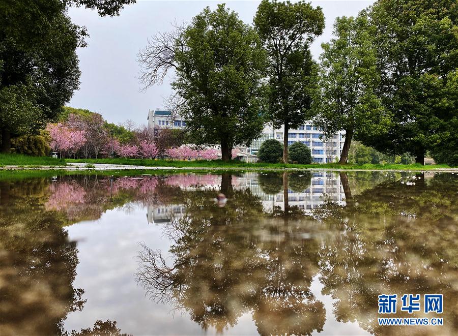 近日,随着气温上升,武汉大学图书馆附近一片樱花开放。 新华社记者 费茂华 摄