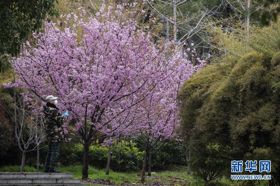 3月3日,一名工作人员在观赏盛开的樱花。 新华社记者 费茂华 摄