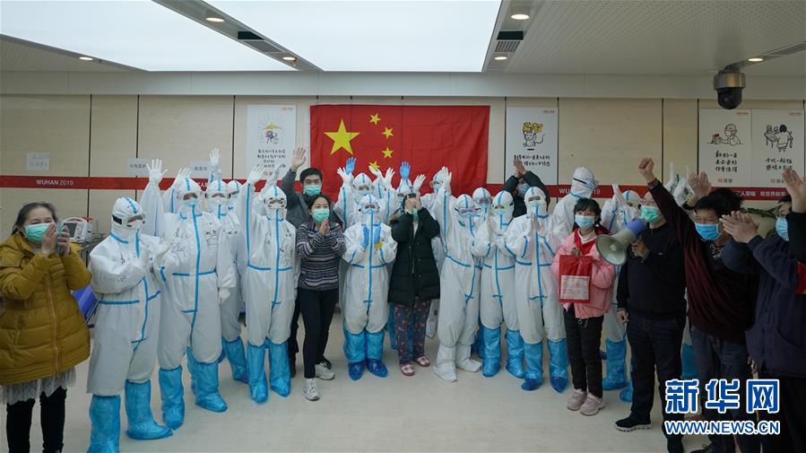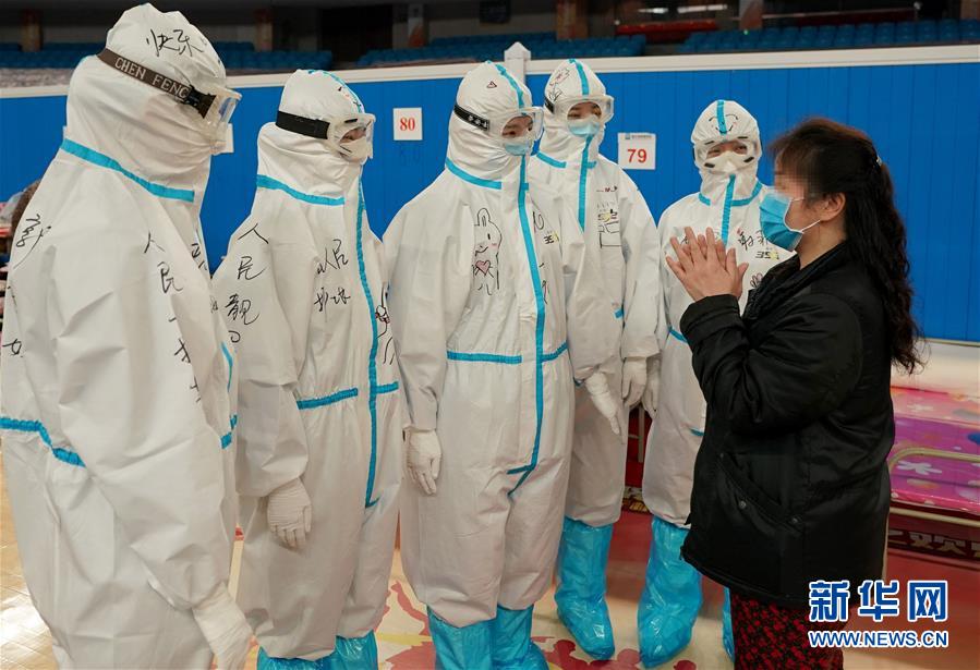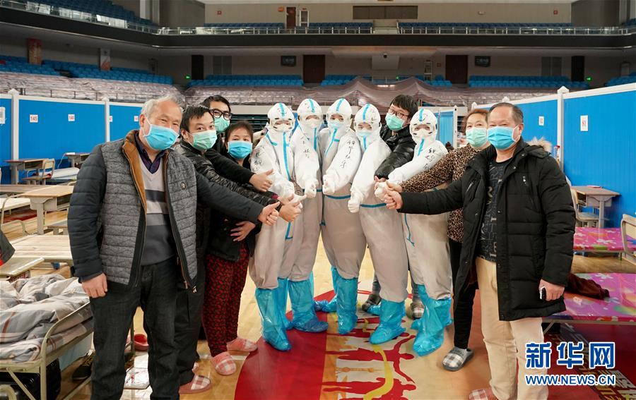 3月8日,武昌方舱医院患者出院前向医护人员告别。 随着患者陆续转院出院,武昌方舱医院舱内患者日益减少。截至3月8日16时,武昌方舱医院累计收治1124人,目前在院116人。 新华社记者 王毓国 摄