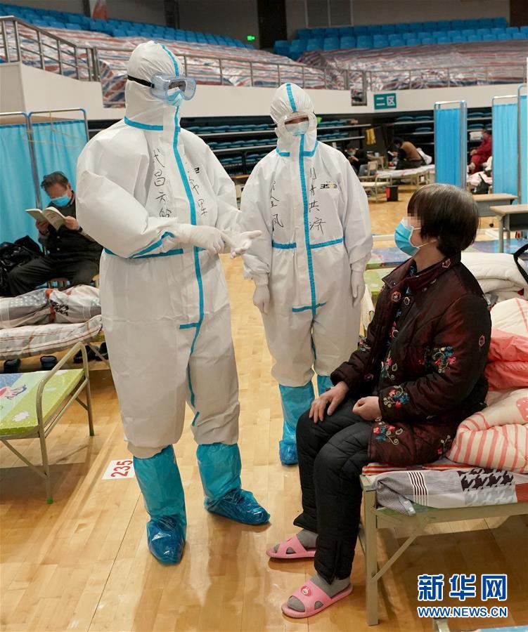 3月8日,武昌方舱医院副院长梁锦军(左一)询问患者病情。 随着患者陆续转院出院,武昌方舱医院舱内患者日益减少。截至3月8日16时,武昌方舱医院累计收治1124人,目前在院116人。 新华社记者 王毓国 摄