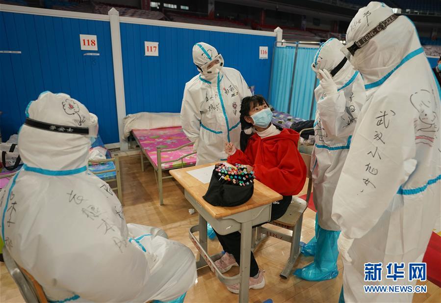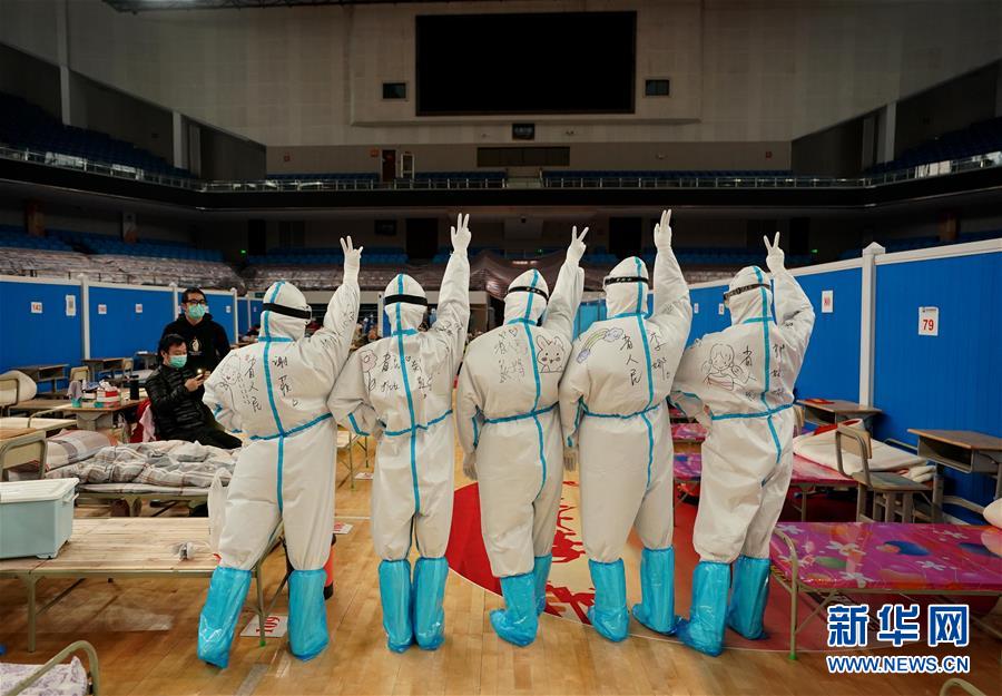 3月8日,武昌方舱医院医护人员展示靓丽“背影”。 随着患者陆续转院出院,武昌方舱医院舱内患者日益减少。截至3月8日16时,武昌方舱医院累计收治1124人,目前在院116人。 新华社记者 王毓国 摄