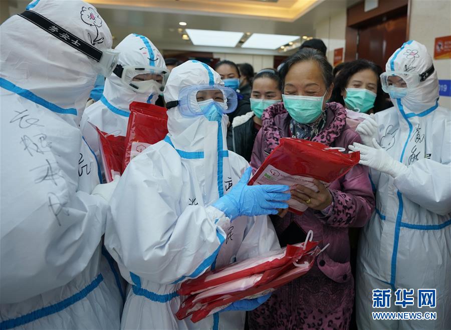 3月8日,武昌方舱医院医护人员给女患者发放礼物,共庆“三八”国际劳动妇女节。 随着患者陆续转院出院,武昌方舱医院舱内患者日益减少。截至3月8日16时,武昌方舱医院累计收治1124人,目前在院116人。 新华社记者 王毓国 摄