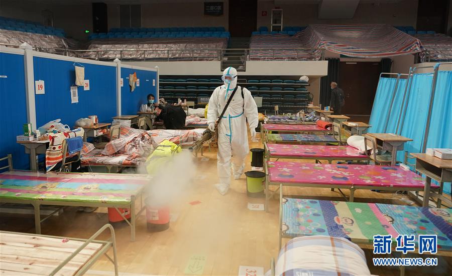 3月8日,武昌方舱医院志愿者对空床进行消毒。 随着患者陆续转院出院,武昌方舱医院舱内患者日益减少。截至3月8日16时,武昌方舱医院累计收治1124人,目前在院116人。 新华社记者 王毓国 摄