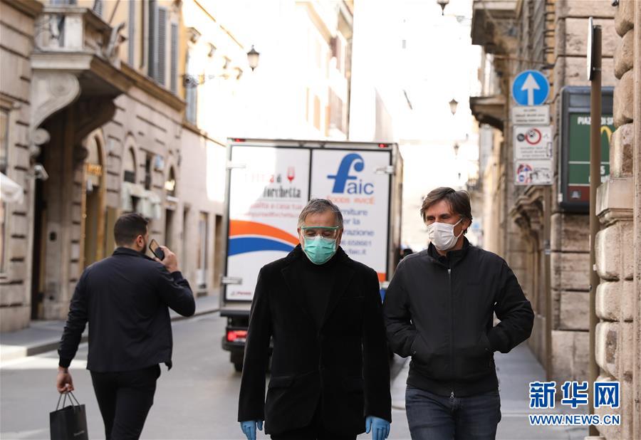 3月10日,在意大利首都罗马,两名男子戴着口罩出行。 新华社记者 程婷婷 摄
