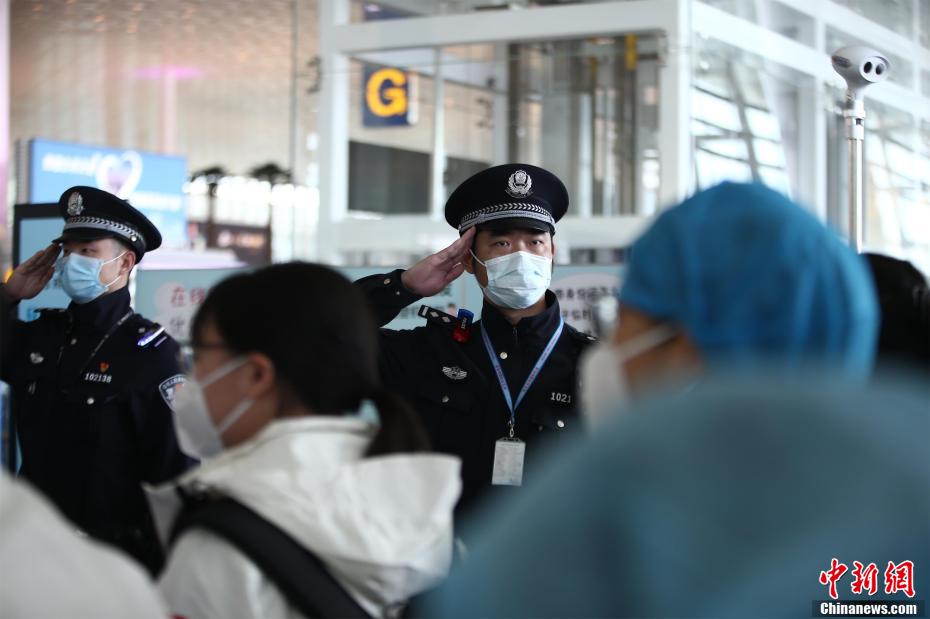 湖北省公安厅机场公安局民警向援鄂医护人员敬礼致敬。 龚轩 摄