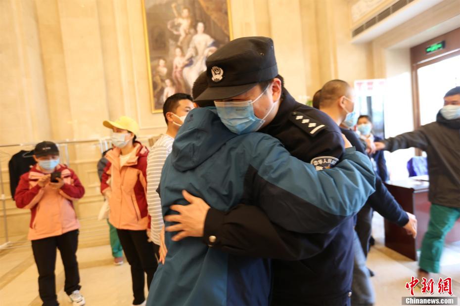 湖南省援鄂医疗队队员与武汉市公安局黄陂区分局民警紧紧相拥。 龚轩 摄