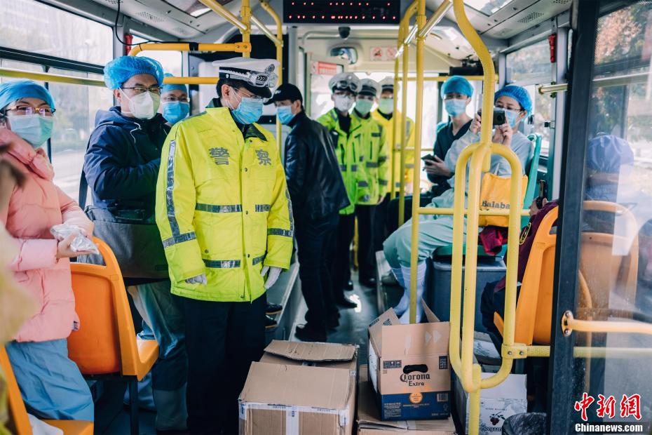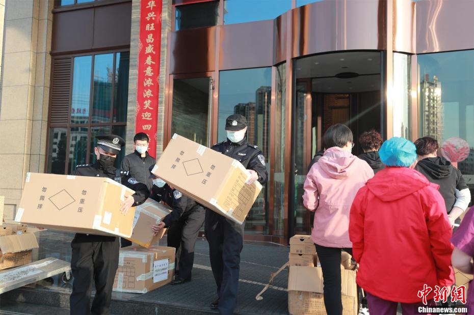 荆门市公安局掇刀分局民警正在为医疗队运送物资。 龚轩 摄