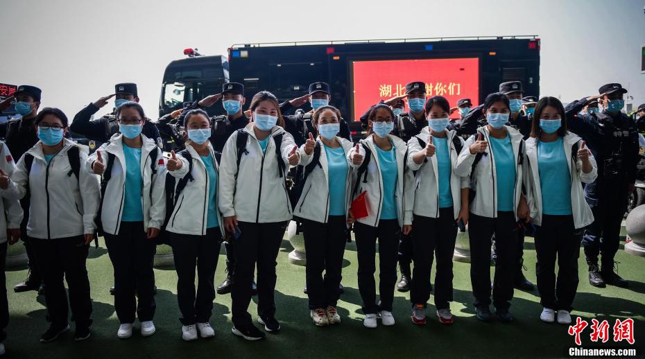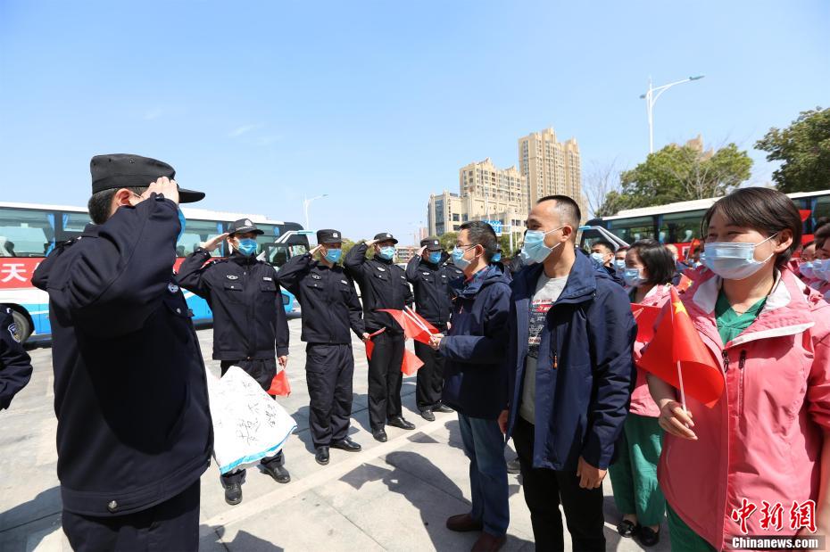 近日,来自全国各地的援鄂医疗队陆续从湖北撤离,踏上返程之路。并肩作战1个多月,湖北公安民警和医护人员产生了浓浓的“战友”情谊。离别之际,他们纷纷握手、拥抱、赠送礼物,相约“江湖”再见。武汉3000名交警全程警车开道、警灯闪烁,并由汉警快骑护送医护人员返程,以“最高礼遇、最深敬意、最佳形象”送别医疗队。图为湖北省公安厅机场公安局民警向援鄂医护人员敬礼致敬。 龚轩 摄