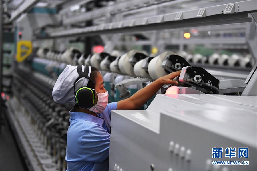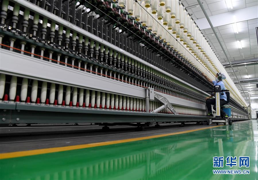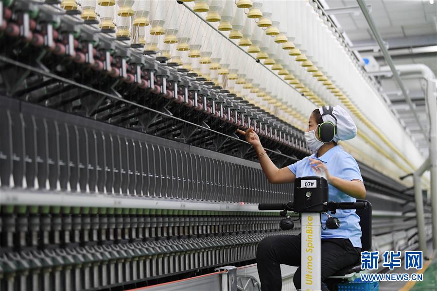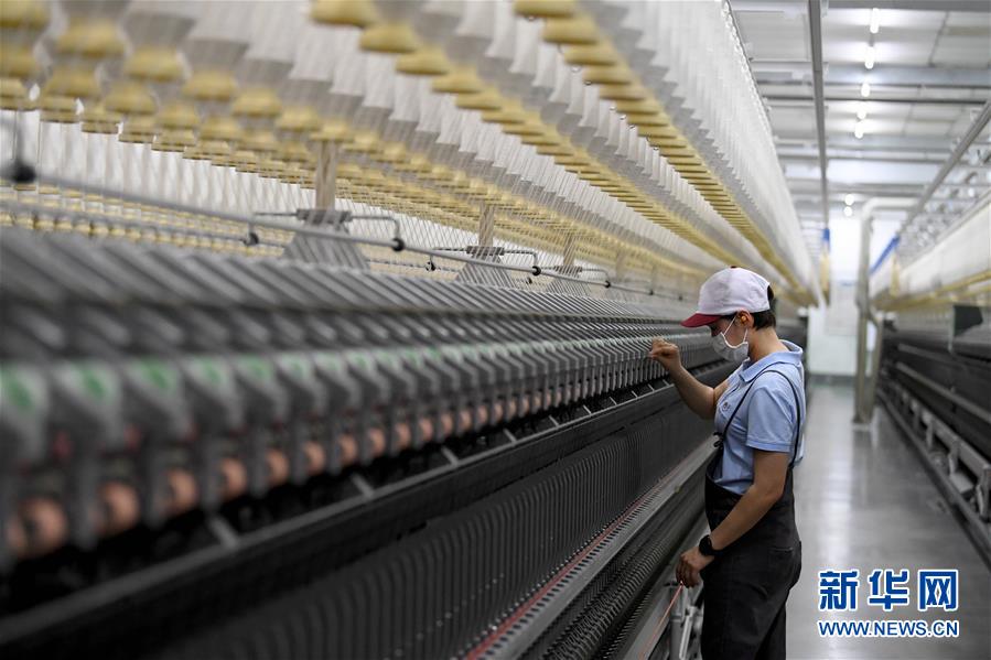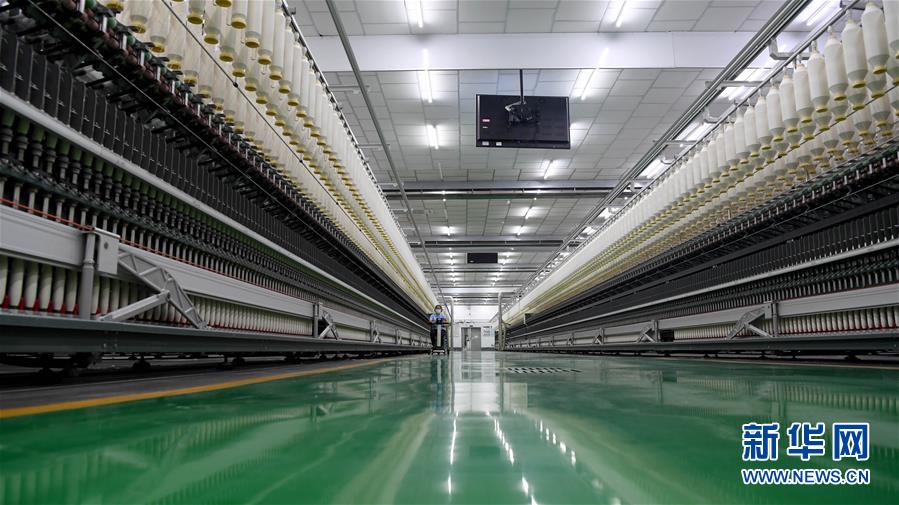 3月17日,在位于新疆昌吉市的昌吉溢达纺织有限公司,工人在车间巡检。 随着新冠肺炎疫情防控形势持续向好,新疆生产生活秩序逐步恢复正常。日前,记者走进位于新疆昌吉市的昌吉溢达纺织有限公司,探访纺织业的“无人”车间。昌吉溢达纺织有限公司2016年引进自动化流水线,整条流水线除远程中控操作外,还可实现手机APP管理。智能化机械生产实现万锭纱线用工15人,而旧的生产线生产万锭纱线则需要60人。工厂2月10日复工以来,超过92%的员工已到岗,产能接近100%。新疆是我国棉花主产区,棉花总产、单产、种植面积、商品调拨量连续25年位居全国第一。2019年,新疆棉花产量继续保持全国最高,达500.2万吨,占全国总产量的84.9%。 新华社记者 沙达提 摄