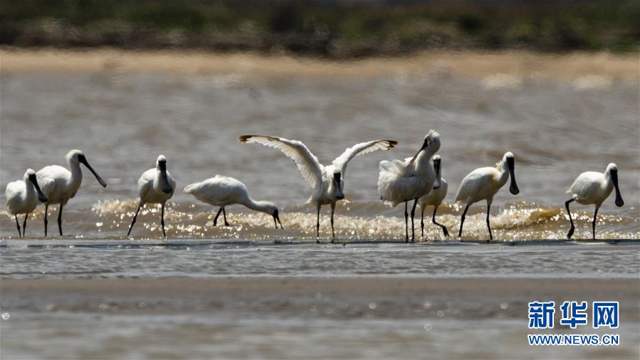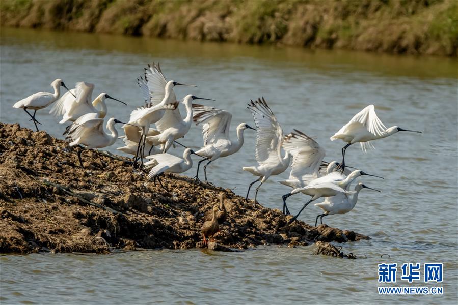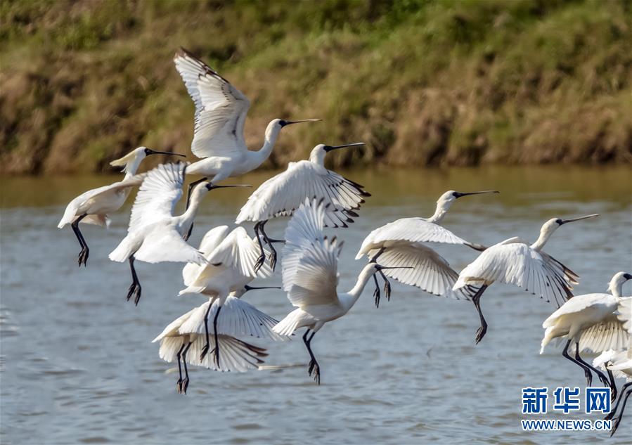 这是在福建闽江口湿地拍摄的黑脸琵鹭(4月12日摄)。 新华社记者 梅永存 摄
