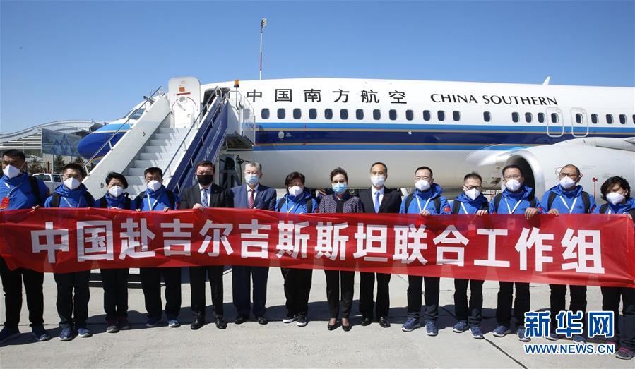4月20日,在吉尔吉斯斯坦首都比什凯克,中国赴吉尔吉斯斯坦联合工作组抵达玛纳斯国际机场后留影。 中国赴吉尔吉斯斯坦联合工作组20日抵达比什凯克玛纳斯国际机场,联合工作组随机携带了由新疆维吾尔自治区捐赠的一批抗疫医疗物资。 新华社发(罗曼摄)