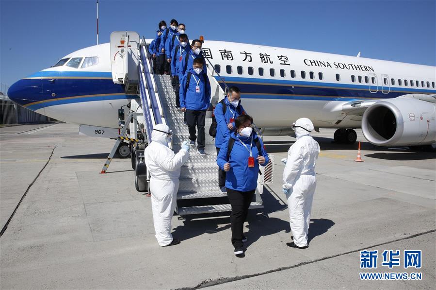 4月20日,在吉尔吉斯斯坦首都比什凯克玛纳斯国际机场,中国赴吉尔吉斯斯坦联合工作组成员走下飞机。 中国赴吉尔吉斯斯坦联合工作组20日抵达比什凯克玛纳斯国际机场,联合工作组随机携带了由新疆维吾尔自治区捐赠的一批抗疫医疗物资。 新华社发(罗曼摄)