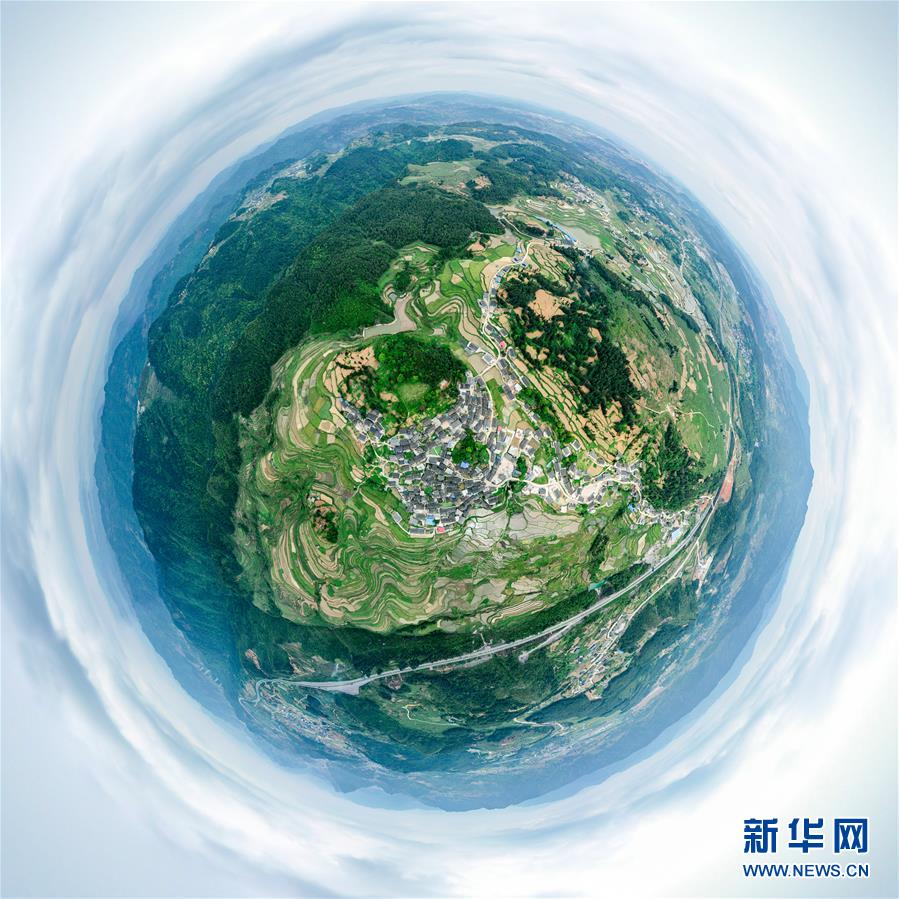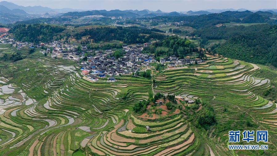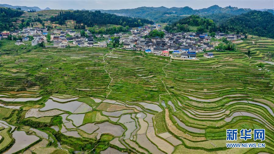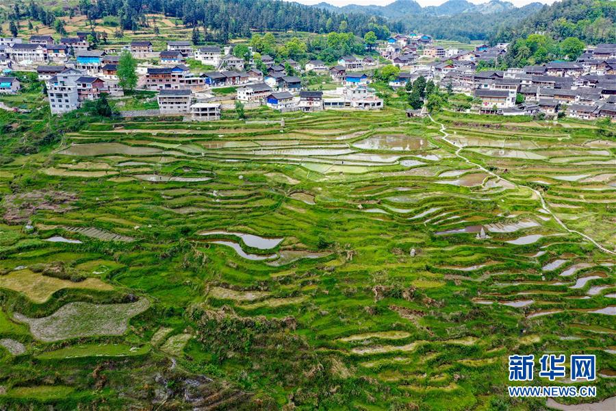 这是4月24日拍摄的贵州省丹寨县龙泉镇高要梯田(无人机全景照片)。 近日,贵州省丹寨县龙泉镇农民抢抓农时进行田间作业,梯田美景如画。 新华社记者 欧东衢 摄
