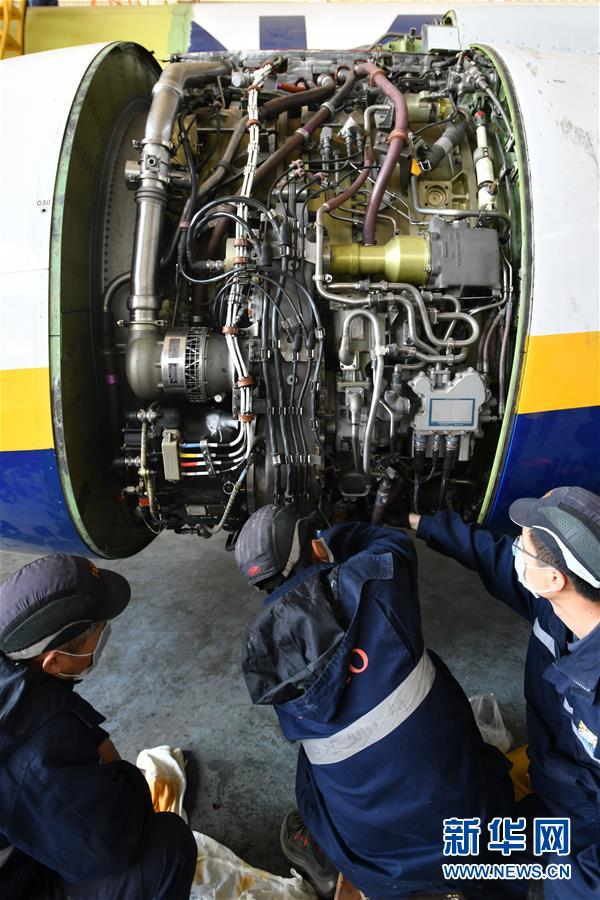 山东太古飞机工程有限公司技术人员在检修飞机发动机(4月27日摄)。新华社记者朱峥摄
