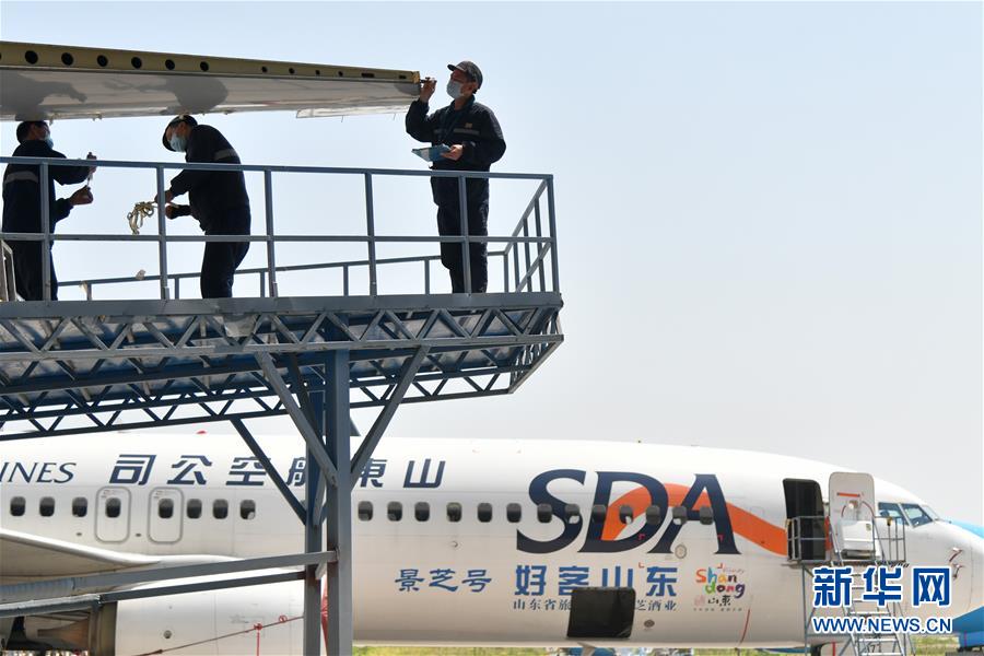 山东太古飞机工程有限公司技术人员在进行改装作业(4月27日摄)。新华社记者朱峥摄