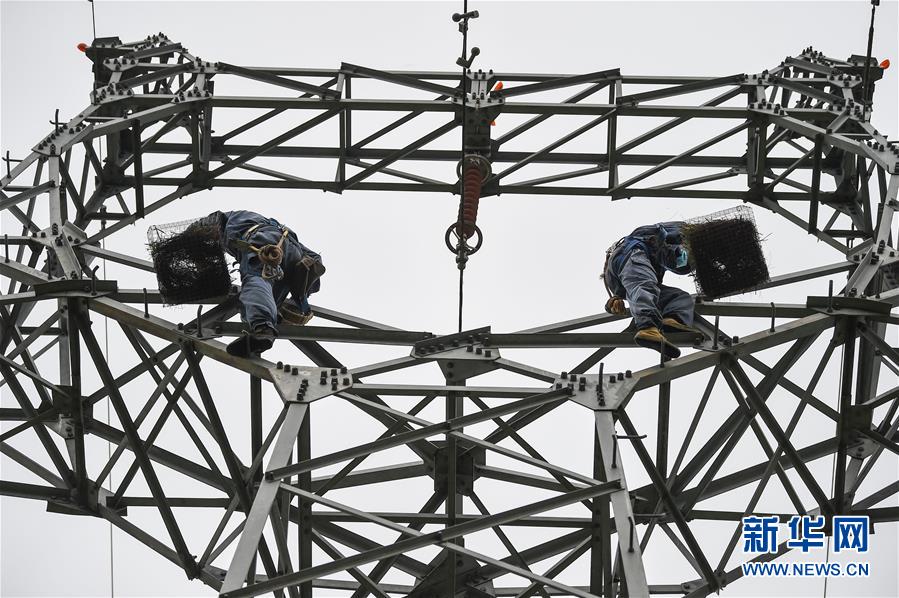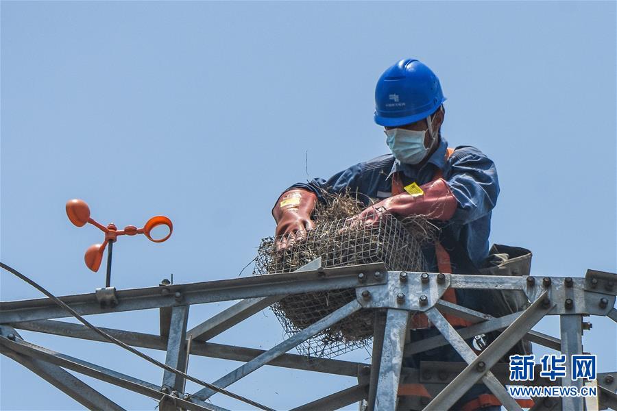 4月28日,在海南文昌一座输电铁塔上,工作人员将一处鸟儿所筑鸟巢整体挪入人工鸟巢内。新华社记者 蒲晓旭 摄