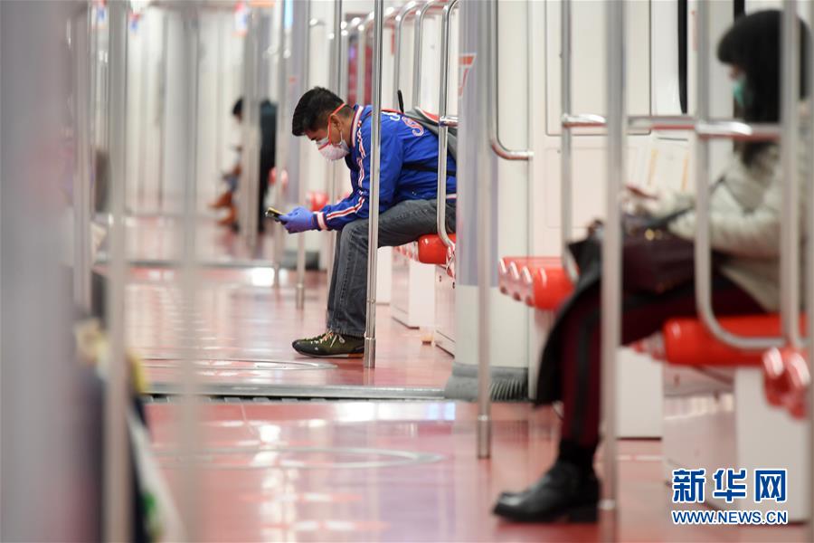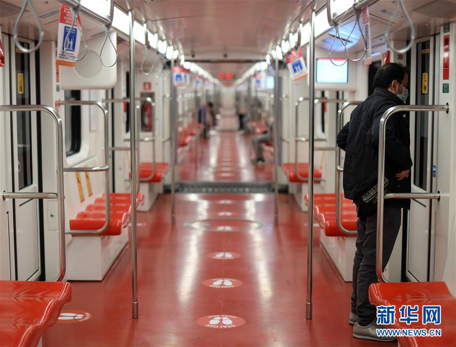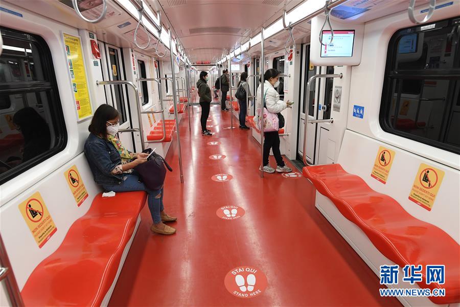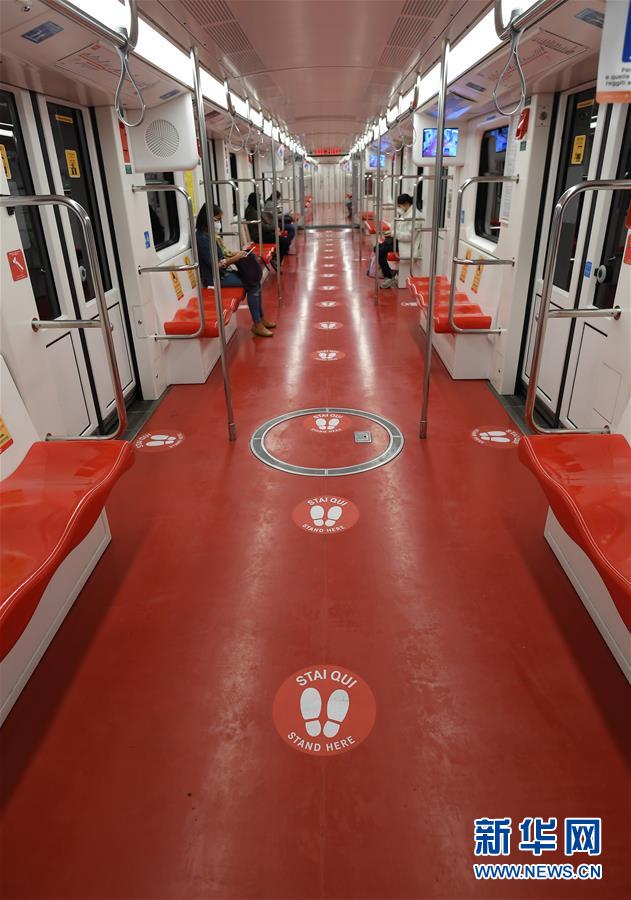 4月29日,在意大利米兰,乘客们戴着口罩保持距离乘坐地铁。 为了保证乘客的社交距离,避免新冠病毒的传播,意大利米兰的地铁车厢内增贴了一系列标识,提醒乘客在车厢内保持距离。 新华社发