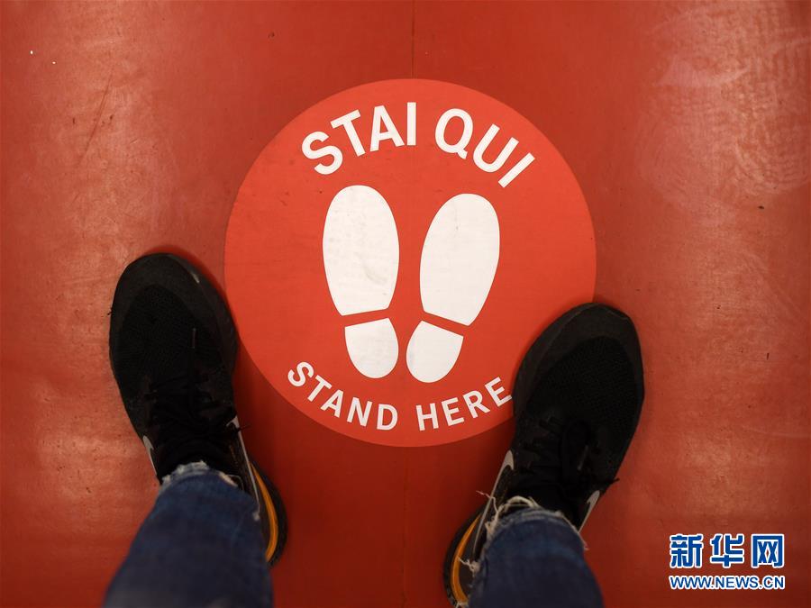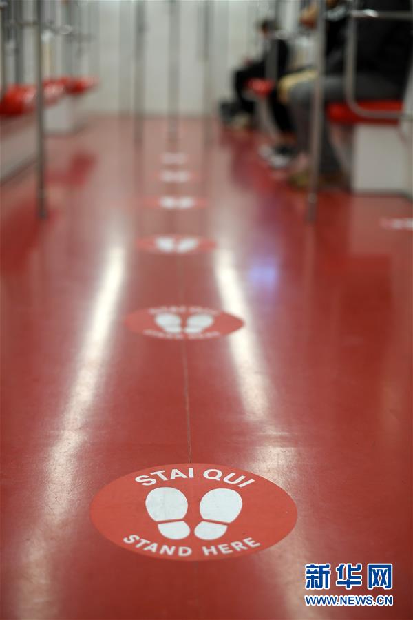 4月29日,在意大利米兰,地铁车厢内地面贴着“站在这里”的标志。 为了保证乘客的社交距离,避免新冠病毒的传播,意大利米兰的地铁车厢内增贴了一系列标识,提醒乘客在车厢内保持距离。 新华社发