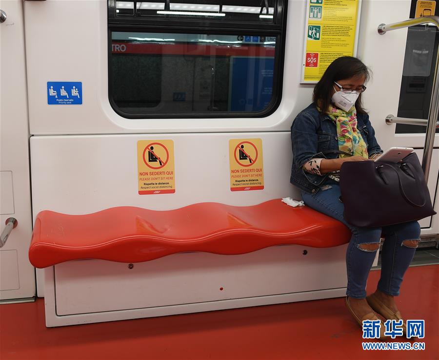 4月29日,在意大利米兰,一名乘客戴着口罩乘坐地铁,座位上方贴着提醒人们隔开距离坐的标志。 为了保证乘客的社交距离,避免新冠病毒的传播,意大利米兰的地铁车厢内增贴了一系列标识,提醒乘客在车厢内保持距离。 新华社发