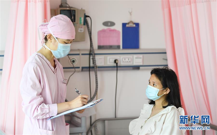 陈志昊(左)在中山大学附属第一医院妇产科病房与孕妇交流(5月9日摄)。 新华社记者 邓华 摄