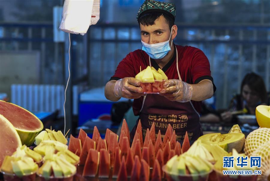 新疆和田夜市商贩展示刚刚切好的瓜果(5月18日摄)。 5月中旬以来,新疆和田气候渐暖,当地旅游经济逐步复苏,笑迎八方游客。和田的夜市逐渐热闹起来,吸引不少游客前来打卡,品尝美食,欣赏歌舞。 新华社记者 王菲 摄