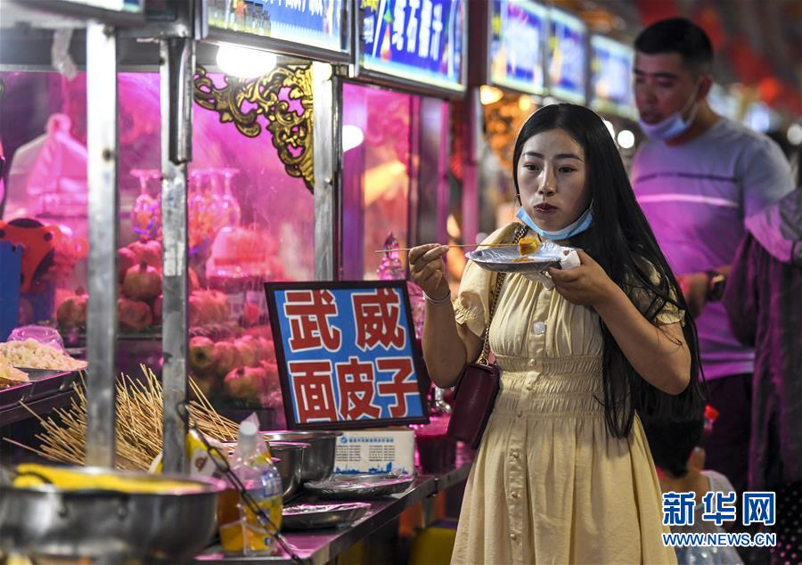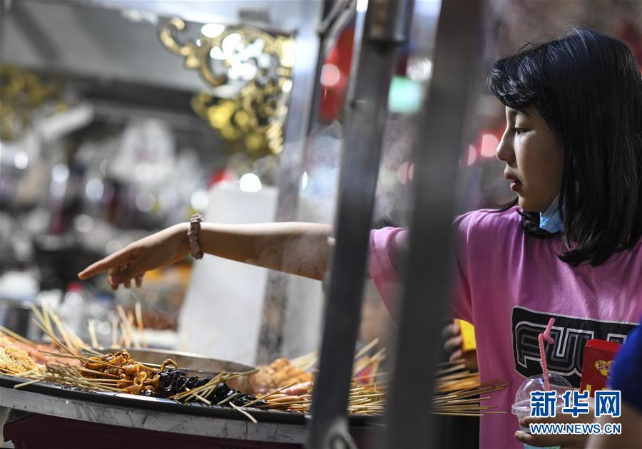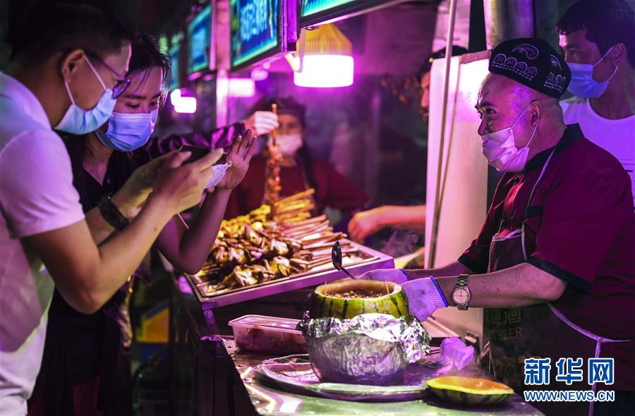 在新疆和田夜市,一名游客在品尝美食(5月18日摄)。 5月中旬以来,新疆和田气候渐暖,当地旅游经济逐步复苏,笑迎八方游客。和田的夜市逐渐热闹起来,吸引不少游客前来打卡,品尝美食,欣赏歌舞。 新华社记者 王菲 摄