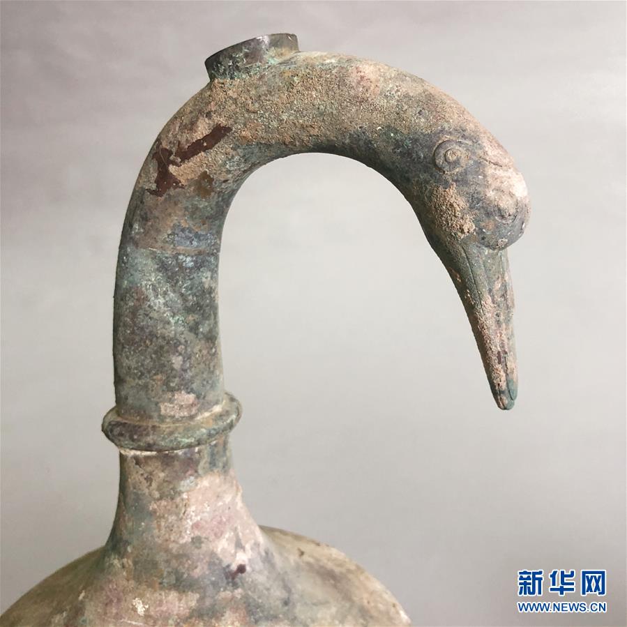 发掘出土的鹅首曲颈青铜壶(5月22日摄)。新华社记者 李丽静 摄