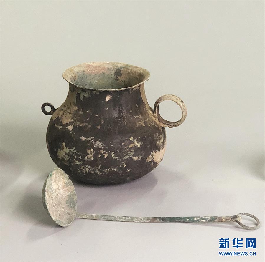 发掘出土的铜鍪与铜勺(5月22日摄)。新华社记者 李丽静 摄