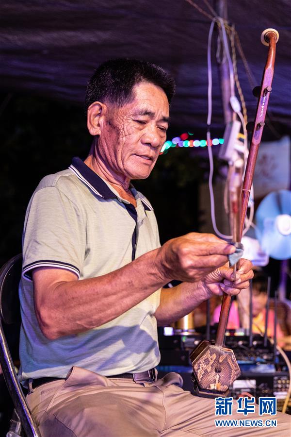 5月24日,海南临高新风人偶戏团成员在演出前调试乐器。 新华社记者 张丽芸 摄
