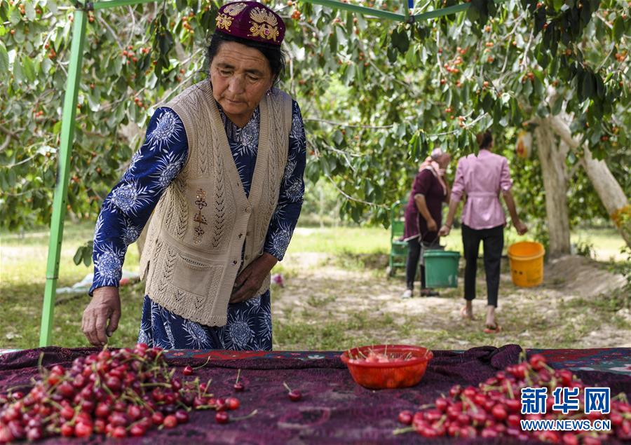时至5月下旬,塔克拉玛干沙漠边缘的新疆莎车县米夏镇数千亩樱桃树硕果累累,吸引游人前来观光采摘。近年来,深度贫困的南疆四地州将特色林果业与旅游业相结合,助力百姓脱贫增收。 新华社记者 王菲 摄