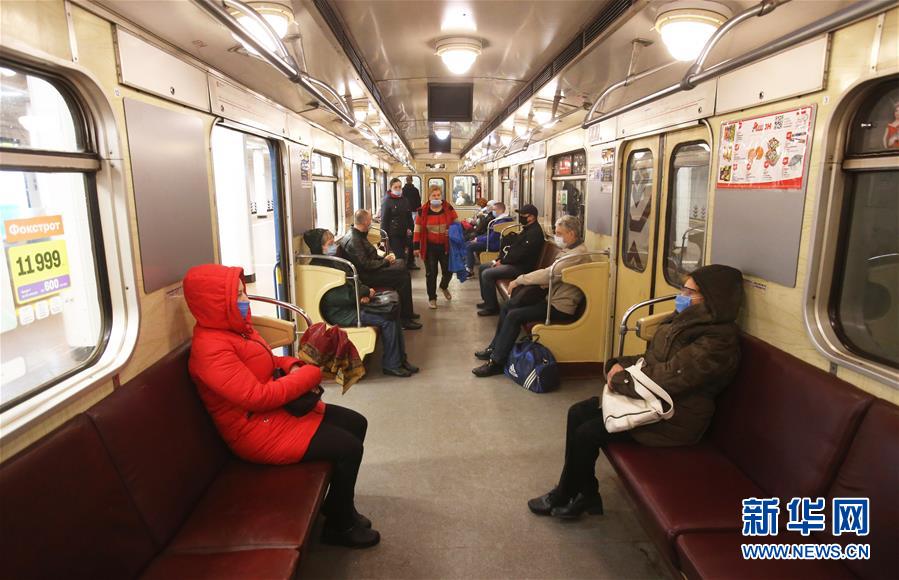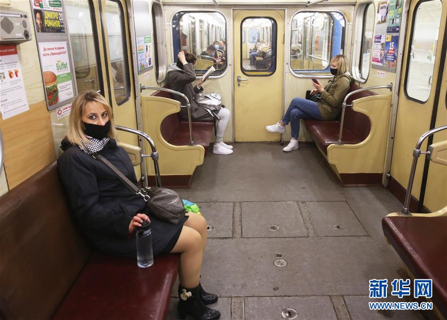 5月25日,在乌克兰基辅市,乘客佩戴口罩搭乘地铁列车。新华社发(谢尔盖·斯塔拉斯坚科摄)