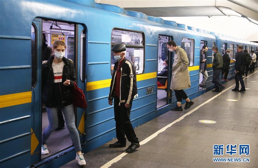 5月25日,乘客在乌克兰基辅市一地铁站内佩戴口罩上下车。新华社发(谢尔盖·斯塔拉斯坚科摄)