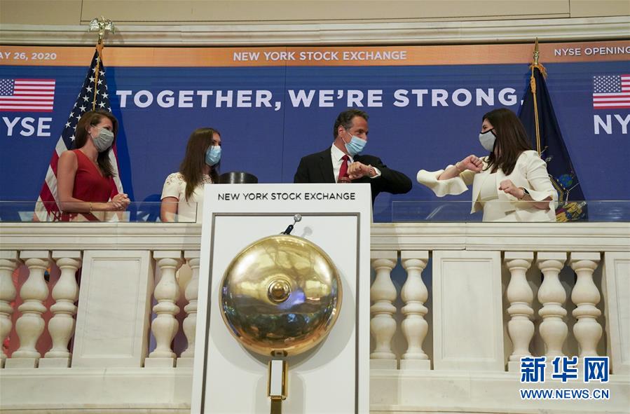 5月26日,在美国纽约证券交易所,纽约州州长安德鲁·科莫(右二)与纽约证券交易所总裁坎宁安(右一)出席开市钟敲钟仪式。