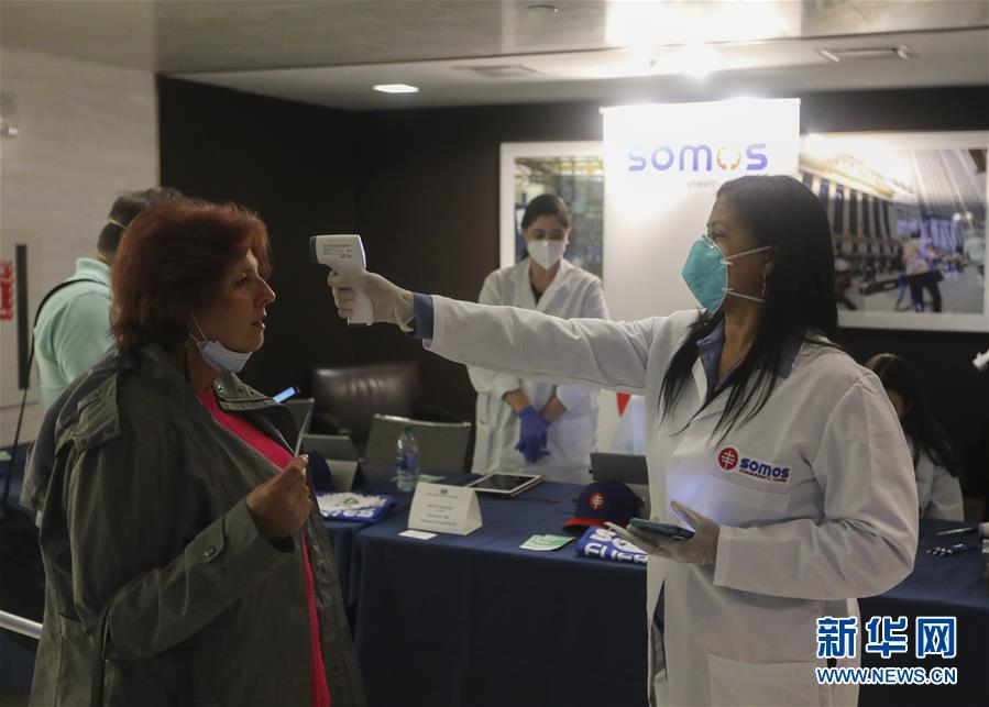 5月26日,工作人员为进入美国纽约证券交易所的女子测量体温。新华社记者 王迎 摄