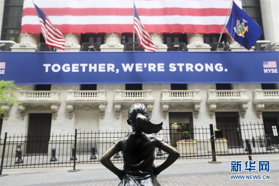 这是5月26日在美国纽约拍摄的“无畏女孩”铜像和对面的纽约证券交易所大楼。 新华社记者 王迎 摄