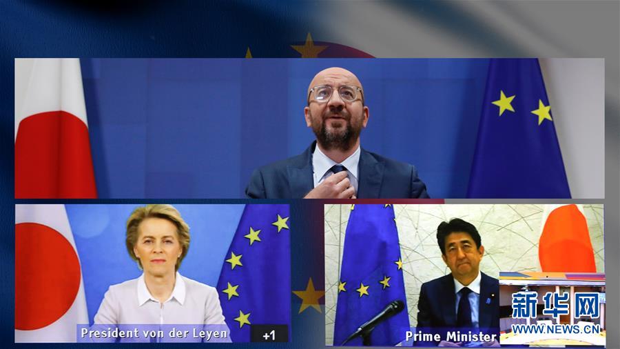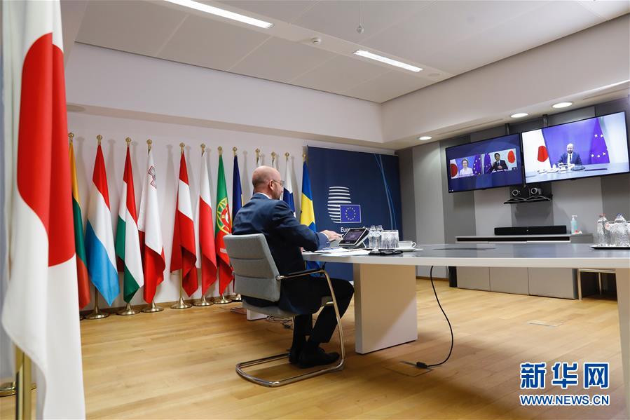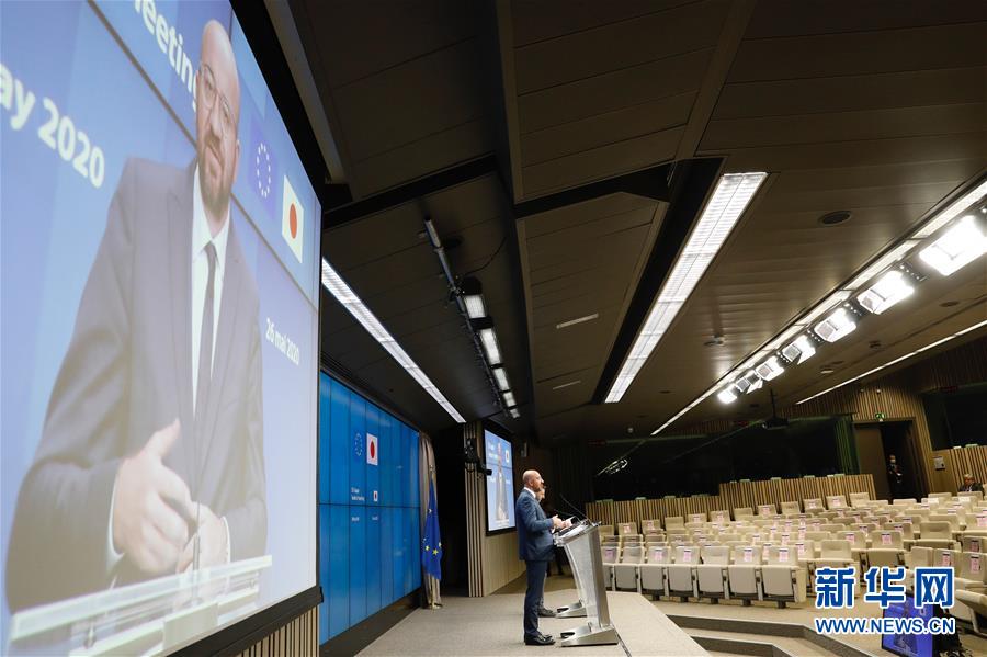 5月26日,欧洲理事会主席米歇尔在比利时布鲁塞尔的欧盟总部出席视频会晤。 欧洲理事会主席米歇尔、欧盟委员会主席冯德莱恩与日本首相安倍晋三26日举行视频会晤,强调全球团结合作,以抗击新冠疫情并确保经济复苏。 新华社发(欧盟供图)