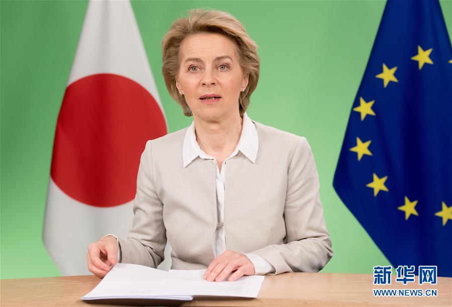 5月26日,欧盟委员会主席冯德莱恩在比利时布鲁塞尔的欧盟总部出席视频会晤。 欧洲理事会主席米歇尔、欧盟委员会主席冯德莱恩与日本首相安倍晋三26日举行视频会晤,强调全球团结合作,以抗击新冠疫情并确保经济复苏。 新华社发(欧盟供图)