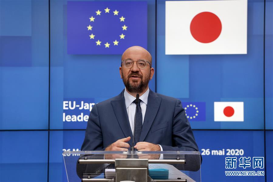 5月26日,在比利时布鲁塞尔的欧盟总部,欧洲理事会主席米歇尔在视频会晤后出席记者会。 欧洲理事会主席米歇尔、欧盟委员会主席冯德莱恩与日本首相安倍晋三26日举行视频会晤,强调全球团结合作,以抗击新冠疫情并确保经济复苏。 新华社发(欧盟供图)