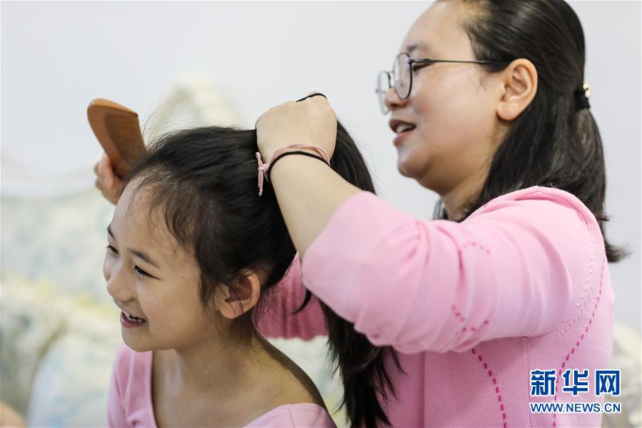 图为5月31日,妈妈黄桅(右)在帮朱皓嫡整理头发,准备练舞。 新华社记者欧东衢摄