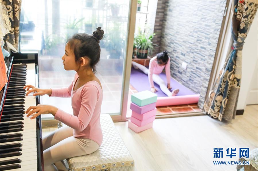 图为5月31日,朱皓嫡(左)在家中弹钢琴,陈熙妍在一旁做拉伸。 新华社记者欧东衢摄