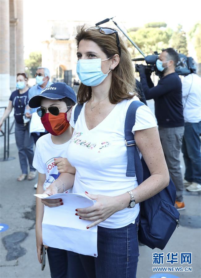 6月1日,在意大利首都罗马,一名母亲带着孩子来重新开放的斗兽场参观。 当日,罗马斗兽场重新开放。出于防疫原因,参观者在入场时被要求戴上口罩、测量体温并进行手部消毒。 新华社记者 程婷婷 摄