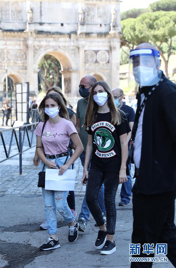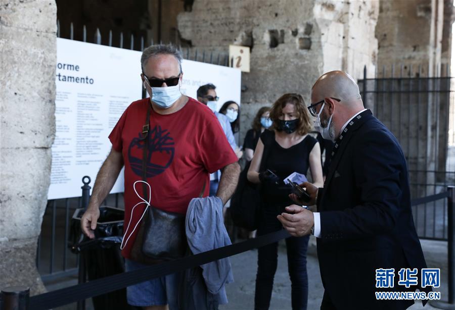 6月1日,在意大利首都罗马,一名工作人员(右)引导游客进场参观。 当日,罗马斗兽场重新开放。出于防疫原因,参观者在入场时被要求戴上口罩、测量体温并进行手部消毒。 新华社记者 程婷婷 摄